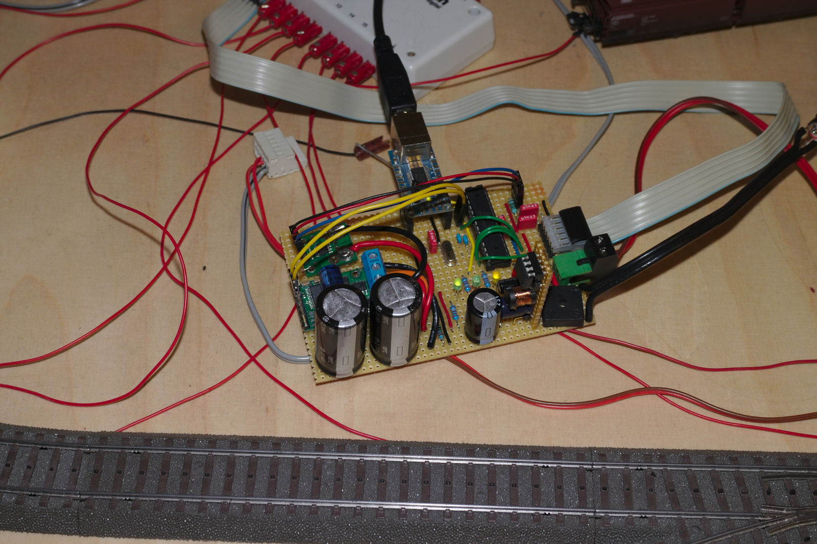 Over the years my locomotive collection grew to include several locomotives with MFX decoders, a more sophisticated protocol not supported by Intellibox. These could still be controlled using the older Motorola protocol, but limited to 14 speed steps and up to four functions (as opposed to 126 and 16). In late 2010 I acquired a second-hand Märklin Central Station. It's a small computer in its own right, with a graphical touchscreen interface. Unfortunately it broke after only two years. I'm fairly sure the fault is in its firmware and not the electronics, but so far I haven't found a way in to debug and fix it.