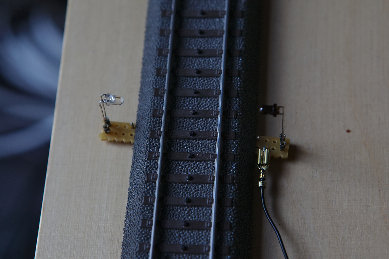 To supplement track circuits, I also use infrared gates. They consist of an IR led on one side of the track and a matching phototransistor on the other side. When a train passes between the two, the beam is broken and the phototransistor ceases conducting. The advantage is that an IR gate occupies a very short length of track, allowing more accurate detection in places that can't fit a track circuit. One such situation at the ends of a station platform or siding, where IR gates can be used to reduce the necessary safety zone. The most prominent disadvantage is the need for extra components, which do not come for free.
