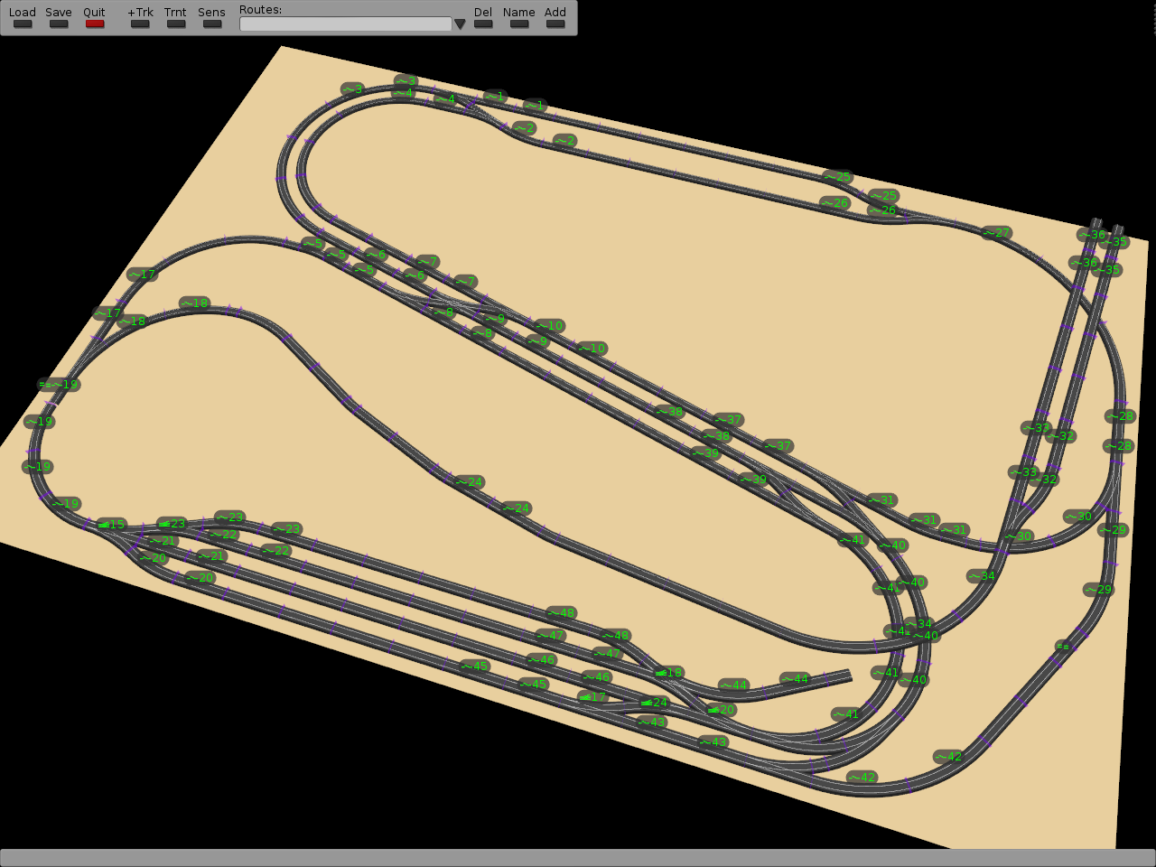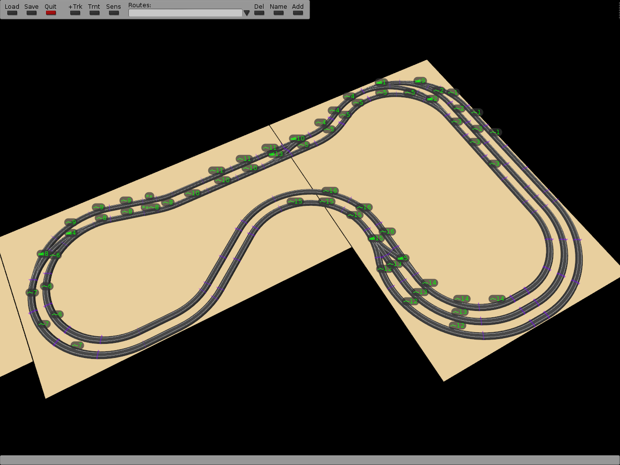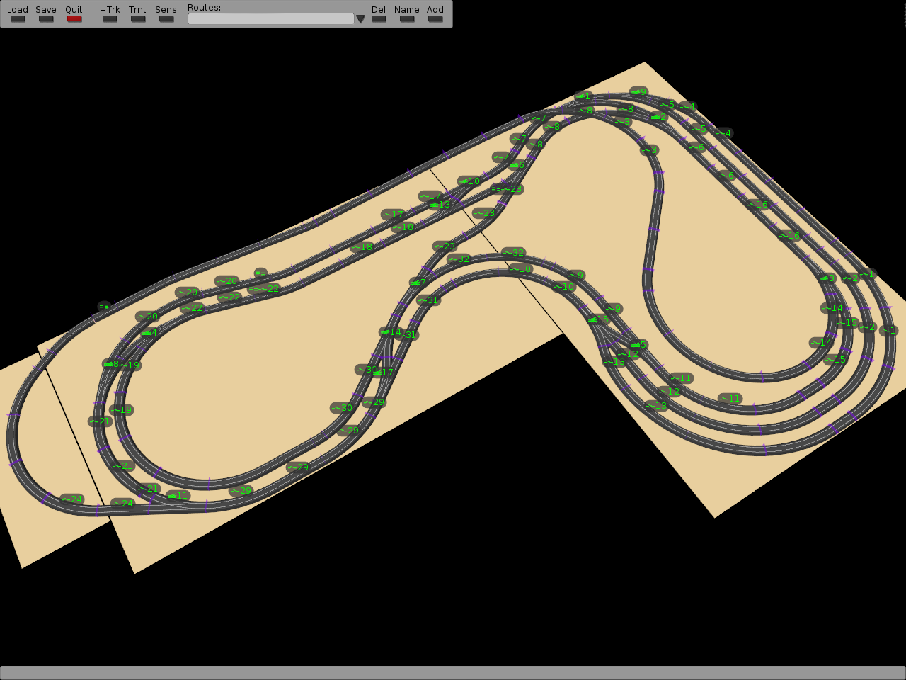 The first layout designed with my software. It was built on two tables in different rooms, with a wall in between.