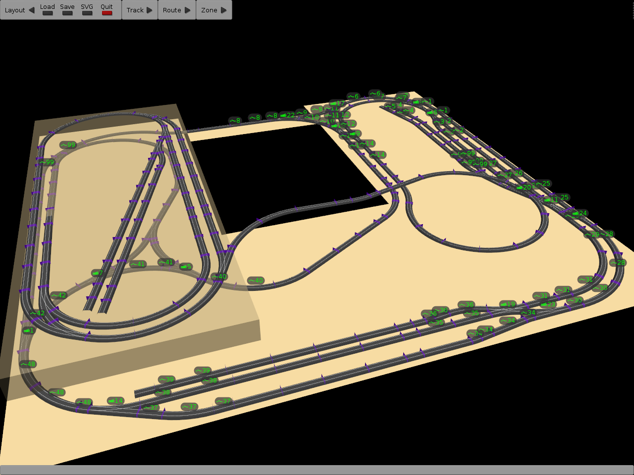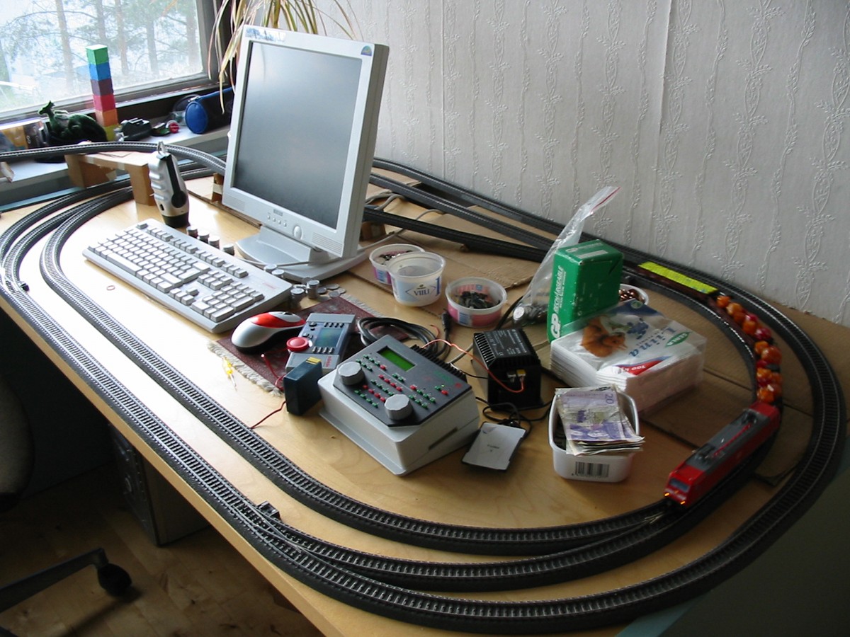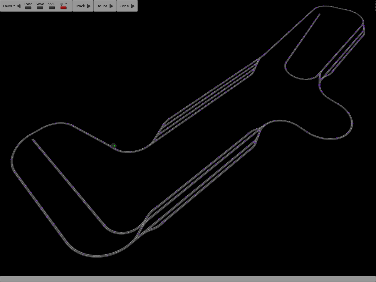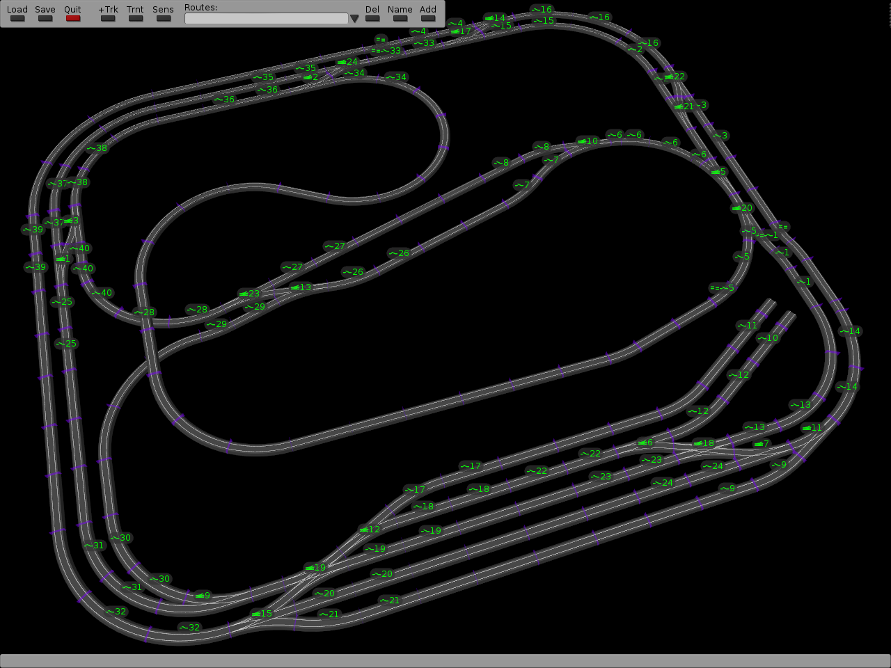 The first layout designed with my software. It was built on two tables in different rooms, with a wall in between.