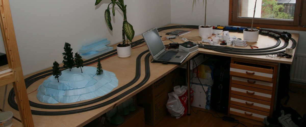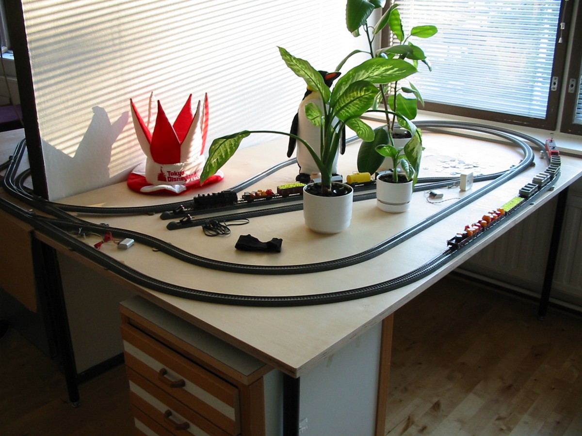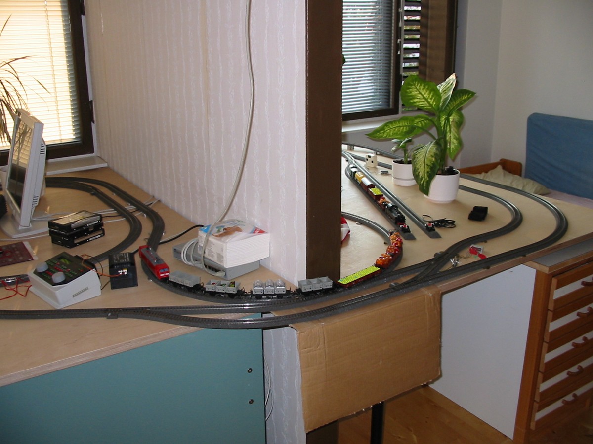After moving to a new apartment, I had both tables available for the railway again. This time they were arranged in a fat "L" shape. The layout was fairly boring, consisting of a double-track loop with a short triple-track section. This was the first layout with full traffic control coverage.