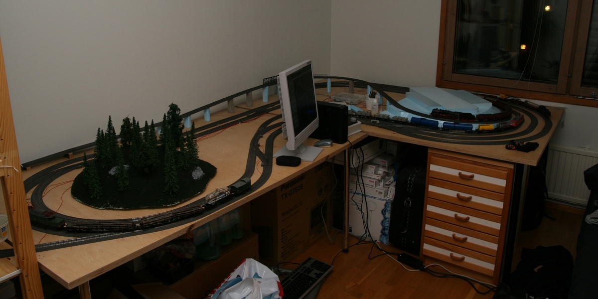 The first layout I had at home. It wasn't really even designed, as the software was not ready yet. It had a bridge, but the ramps were so steep that locomotives had a hard time getting enough traction to climb it and often had to be helped by hand.