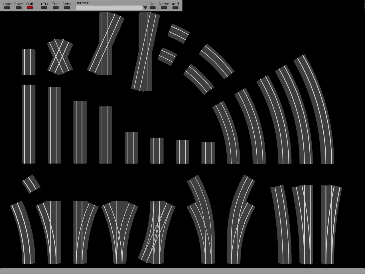 The designer allows planning a layout with an unlimited supply of tracks. Various tools like cloning entire sections of tracks and snapping them into free endpoints speed up building complex layouts. Grid-based heightmap terrain can be created, though tracks will just as happily hang aroudn in empty space. Turnout and sensor IDs of tracks can be indicated for operating the layout. Routes and zones can be defined for automatic operation.