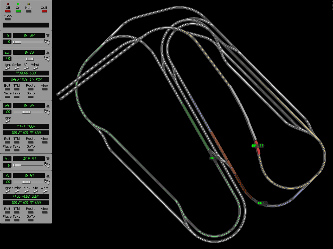 The engineer is used to run trains on a layout made with the designer. There are three main modes of operation. Trains can be run freely, taking whatever path turnouts are set to. A route (as specified in the designer) can be selected for the train to follow; if the train is not on the route it will find its way to it. And finally, there's a timetable system for fully automatic operation. Any of these may be selected on a per-train basis. In all cases, traffic control makes sure that trains won't collide.